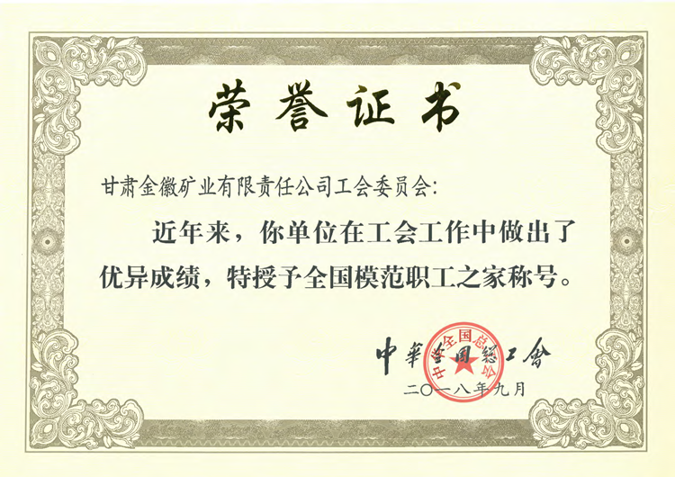 近日,金徽股份工會榮獲“模范職工之家”榮譽稱號,這是繼金徽股份榮獲全國首批綠色工廠,入選國家級綠色礦山名錄之后獲得的又一項國家榮譽。