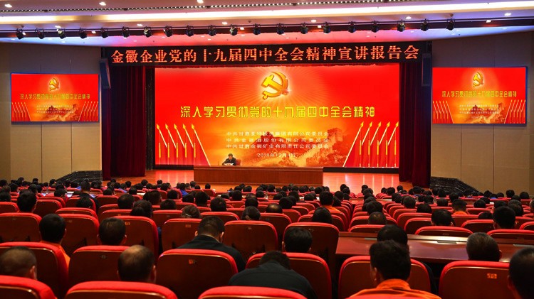 12月4日,金徽企業(yè)舉辦了學習貫徹黨的十九屆四中全會精神宣講報告會,中共徽縣委書記王強作了專題宣講報告。包括金徽礦業(yè)股份有限公司、金徽酒股份有限公司、金徽現(xiàn)代農業(yè)公司、金徽新科材料公司、金徽物業(yè)公司在內的金徽企業(yè)黨員以及入黨積極分子400余人參加宣講會。